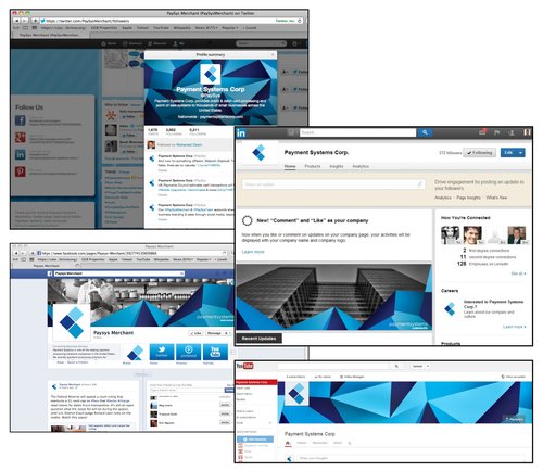 Payment Systems’ social media presence had previously been inconsistent, so with the assistance of another designer and a copywriter, the Twitter, YouTube, LinkedIn, and Facebook pages were re-done with a consistent look and voice. New cover photos, page banners and icons were created to tie the different social media networks together. Multiple social media accounts were created for different groups: employees, customers, and corporate-based general information.